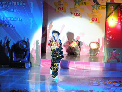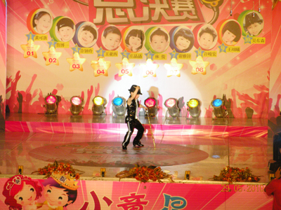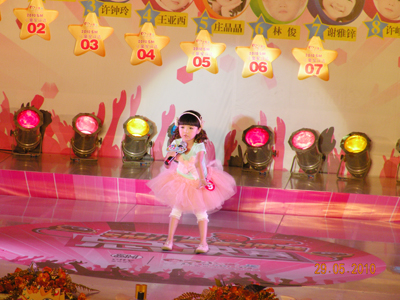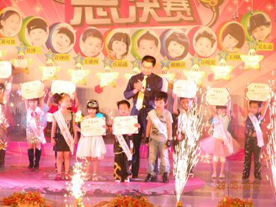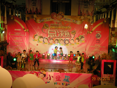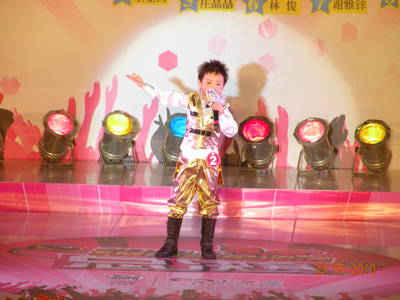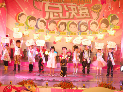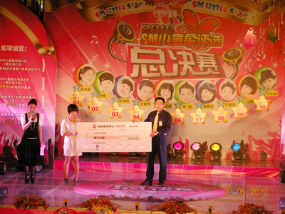 里三层,外三层,2010年小童星评选决赛现场热闹非凡,亲友团阵势蔚为壮观,家长们手持拍手器,嘴含小哨子,外加缤纷多样的加油牌,舞台周围被挤得水泄不通。随着一波一波的加油呐喊声愈演愈烈,决赛终于在千呼万唤中闪亮开始。首先出场的是10强选手中年纪最小的小公主,人小志气大的她自信十足,靓丽外形与不俗才艺深深吸引了在场的观众,为比赛打响了开门红。随后登台的架子鼓表演,妩媚舞蹈《Nobody》与Q版小沈阳更是将精彩继续并不断升级,使现场洋溢在一片浓浓的欢乐童趣中。凭借“盖世武功”获得男孩组冠军的林俊技压群雄,一登场就以其大将风范、完美武艺征服了评委及观众,获得全场最高分的佳绩。女子组冠军庄晶晶则以其不俗台风在众多小美女中脱颖而出,夺得2010SM小童星评选的女孩组桂冠。冠军得主实至名归,其余选手也并不逊色,他们在SM舞台上充分展现了自己的才艺与风采,在SM小童星评选之路中留下了自己的光辉印记。虽然2010年SM小童星评选已经完美落幕,但他们的天真无邪、活泼可爱早已被载入SM小童星评选的史册中,希望他们能在更多的舞台上绽放出自己的光彩,创造更加瞩目的未来。