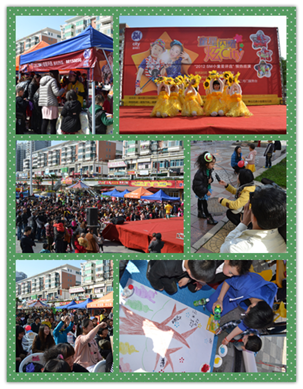 2012年SM小童星评选活动自正式启动以来,便成了广大市民争相热议的话题。为了给即将盛大开启的SM小童星评选比赛宣传造势,SM携手晋江石狮等地区的众多幼儿园及往届小童星们开始了为期一个月的巡演,从3月4日起陆续走进了石狮金汇小区、晋江华泰小区、竹园小区及福隆广场,给各小区居民们带来了精彩的演出及丰厚的奖品。巡演每到一处,都引起小区居民们的热烈追捧,除了欣赏台上精彩的演出、参加好玩的互动游戏,家长们更是主动询问比赛的各个细节,积极地给自家宝宝报名,报名现场热闹不已。