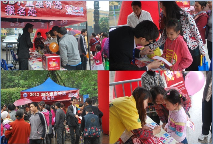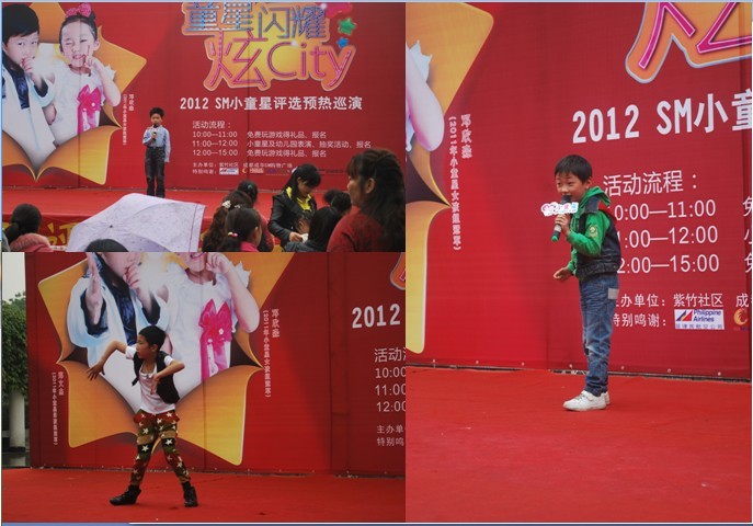 4月7日,一个细雨霏霏的星期六,“2012SM小童星评选”巡演活动的最后一场在紫竹广场如期展开。往届小童星和紫荆幼儿园的小朋友们,冒雨来到了活动现场,带来一场精彩演出。